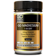 GO Magnesium 1-A-Day is a potent formula providing 500mg of elemental magnesium per capsule. Derived from seawater, this natural marine magnesium is free of magnesium oxide, ensuring superior absorption and gentleness on the digestive system. Magnesium is effective in supporting relaxation, soothing muscle tension and muscle tightness as well as for supporting a good nights sleep. Magnesium is one of the most important nutrients as it is involved with hundreds of processes within the body but is easily depleted when the body is under stress from things such as exercise, stressful situations, poor diet and alcohol or just from having a modern busy lifestyle. GO Magnesium 1-A-Day is a great way of ensuring you get your recommended daily intake of this vital mineral to help keep operating at your best.